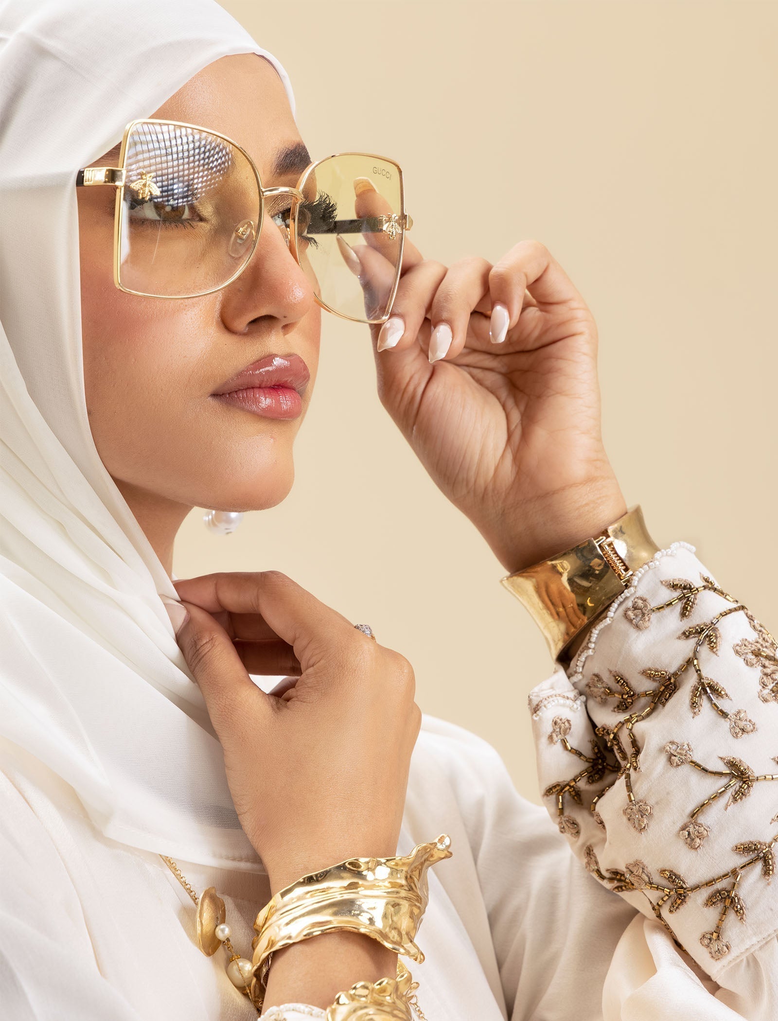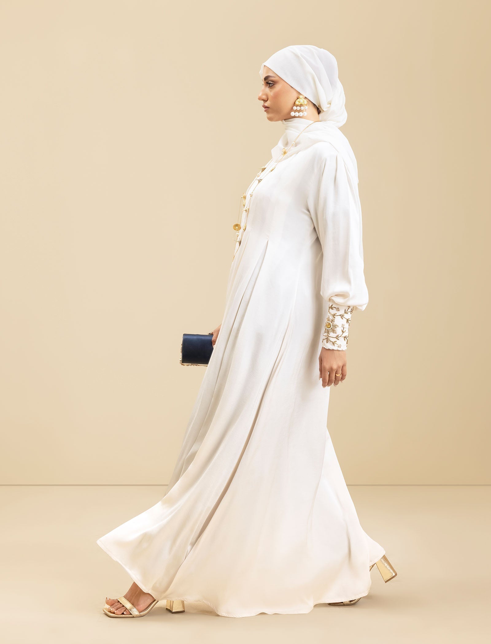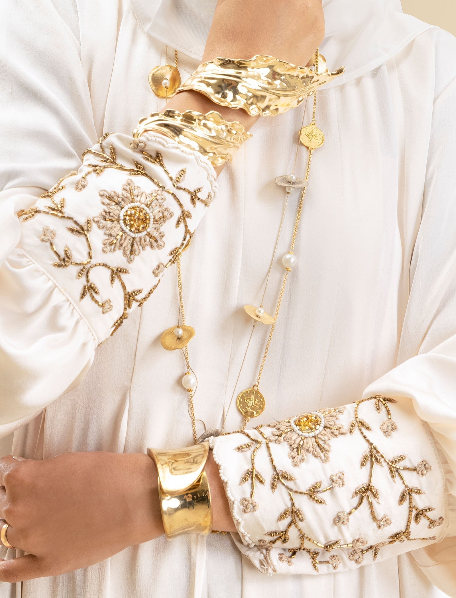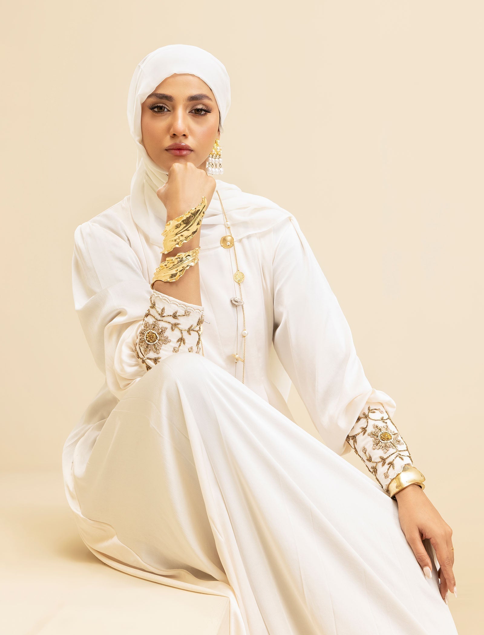 The Pure Pearl abaya is crafted from luxury silk, offering a smooth, sophisticated finish. The cream-colored fabric exudes elegance, while the exclusive handwork on the cuffs adds a refined touch, making this abaya a true style statement.